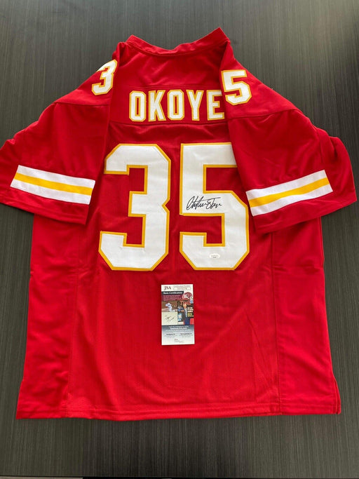 Hand-signed by Christian Okoye, this Jersey is a one-of-a-kind piece of sports memorabilia that will surely be the highlight of any Kansas City Chi...